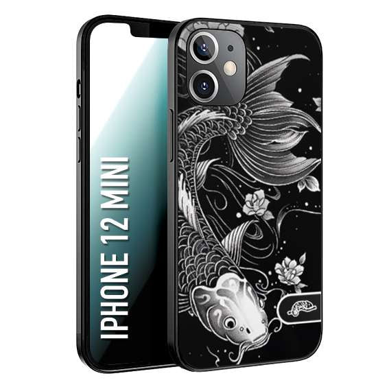 CUSTOMIZZA - Custodia cover nera morbida in tpu compatibile per iPhone 12 MINI carpa koi black and white bianco a rilievo disegnato tattoo tatuaggio