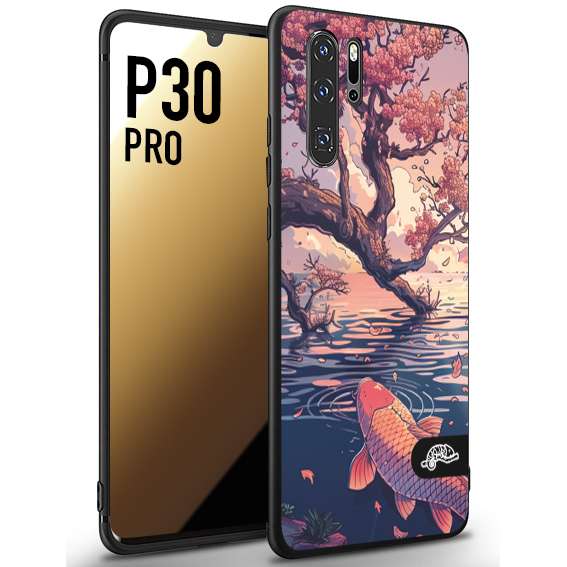CUSTOMIZZA - Custodia cover nera morbida in tpu compatibile per Huawei P30 PRO giapponese lago carpa koi rosa con foglie d'acero disegnata tattoo