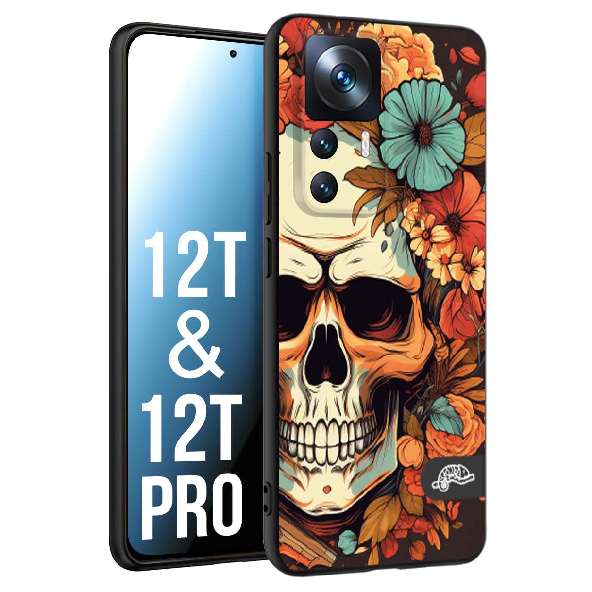 CUSTOMIZZA - Custodia cover nera morbida in tpu compatibile per Xiaomi 12T - 12T PRO teschio skull flowers fiori autunnali arancio celeste tattoo
